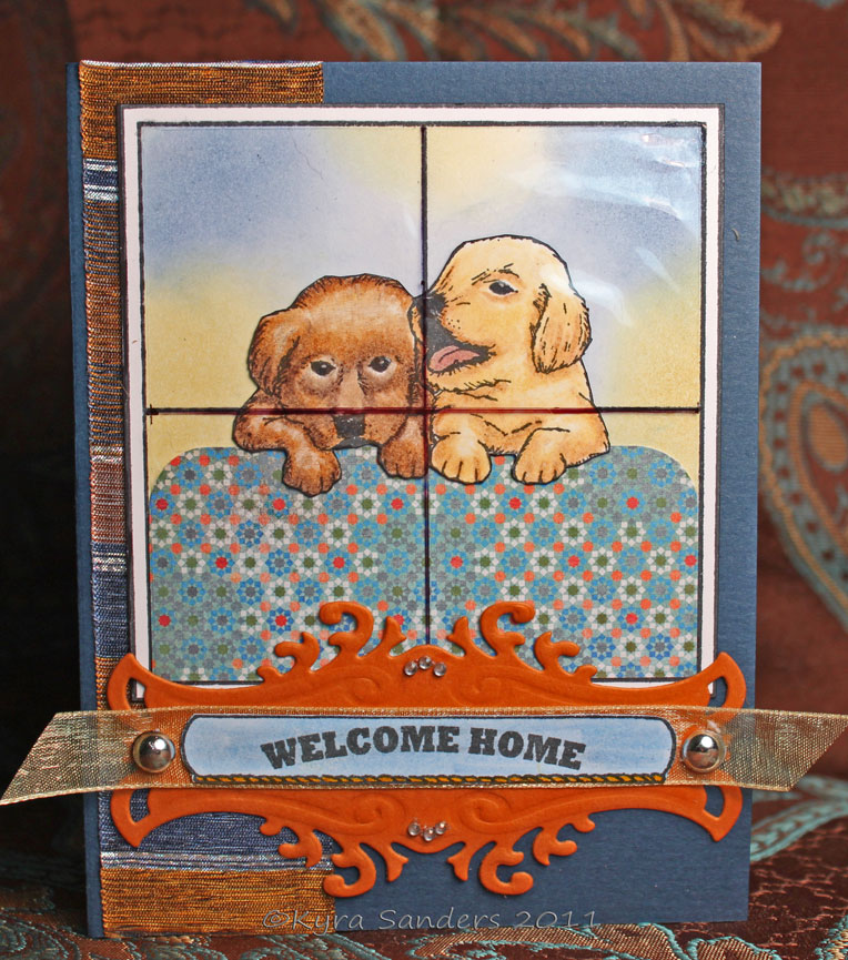 I simply created a 'sofa' of Basic Grey paper, overlaid clear plastic, and superimposed the cross lines for the window. The plush bed works great with the sentiment from Nina's Lovely Labels 3 and a Spellbinder's Fancy Tag #2 die. Just add some ribbon (wide ribbon on the left is May Arts, across tag die is organdy) and some bling, and there you have it!